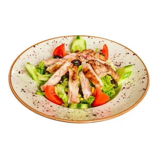 Domates, salatalık, marul, zeytin, ızgara tavuk. Seçeceğiniz sos ile servis edilir.