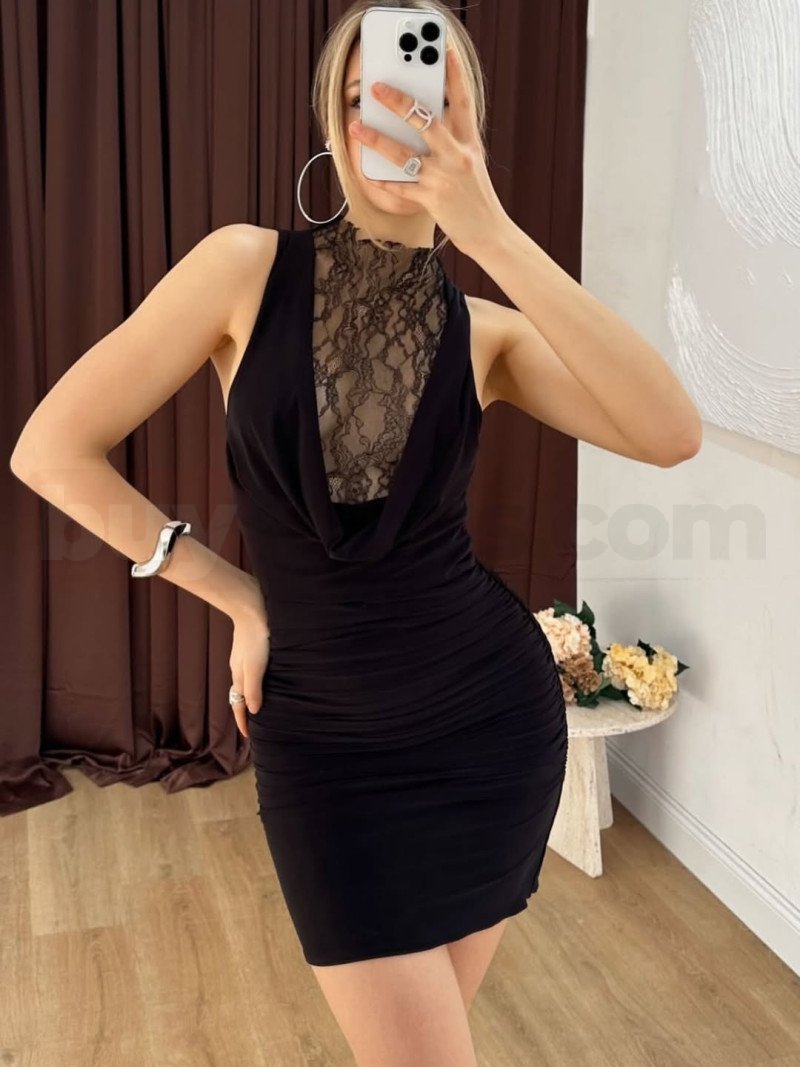 Siyah Dantel Detaylı Mini Elbise