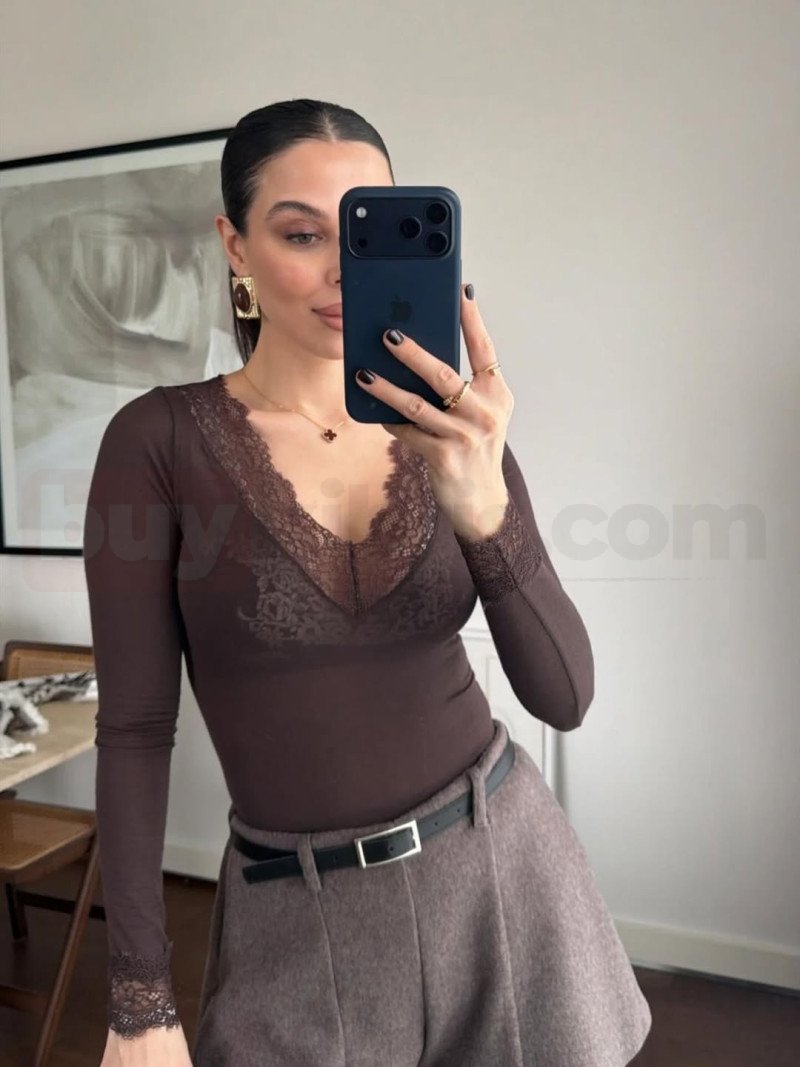 Kahverengi Dantel Detaylı Bluz | buykibris.com