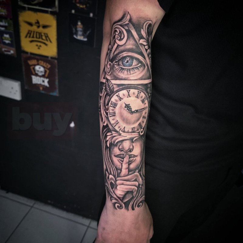Göz, saat ve kadın figürünün birleşimiyle oluşturulan bu özel dövme, zamanın akışı ve gizemin gücünü simgeleyen derin bir anlam taşır. Kıbrıs’ta sanatsal dövme anlayışını üst seviyeye taşıyan 777 Tattoo, bu tarz detaylı çalışmalarda gölgelendirme, oran ve kompozisyonu kusursuz şekilde bir araya getirir. Kıbrıs’ta hem anlam yüklü hem de görsel olarak etkileyici bir dövme yaptırmak isteyenler için bu tarz konsept tasarımlar, güçlü bir ifade ve kalıcı bir sanat eseri sunar.