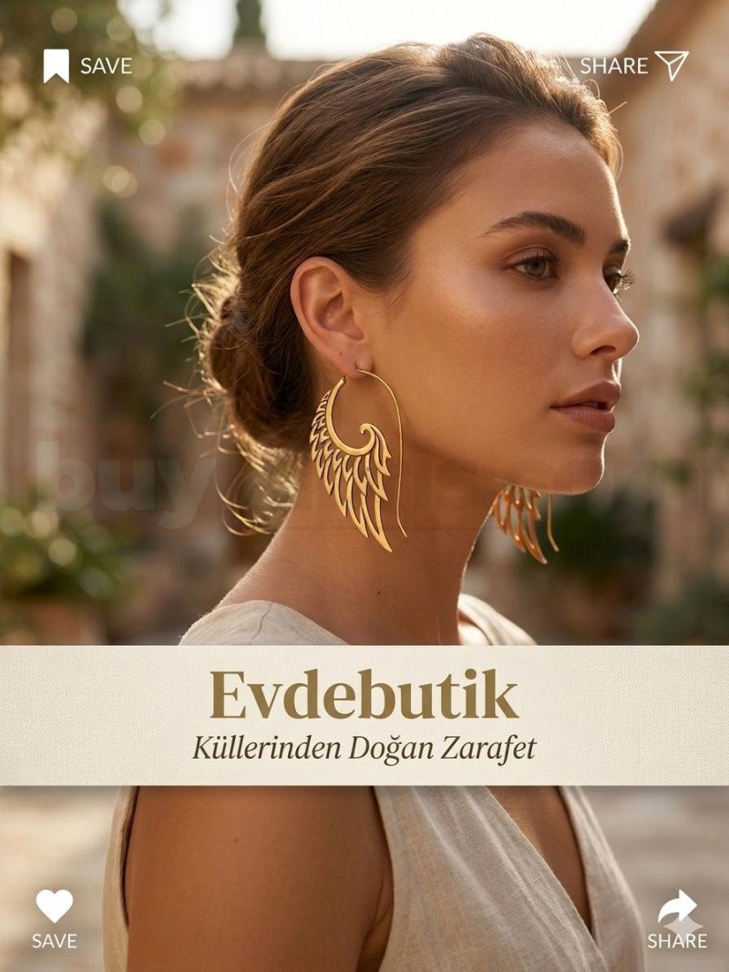 “Pirinç sıcaklığı ve kanatların hafifliği... Bu küpeler, sadece bir takı değil, ruhunun bir ifadesi. Her adımda zarafetin dansını sergilemek, her bakışta tutkuyu hissettirmek için tasarlandı. Kendi masalının kahramanı ol.”