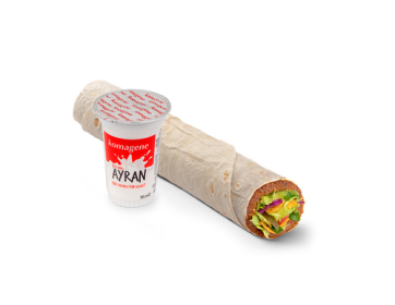 Çiğ Köfte Dürüm (90 gr. çiğ köfte, tek lavaş, seçeceğiniz 5 çeşit garnitür, seçeceğiniz 2 çeşit sos) + Komagene Ayran (17 cl.)