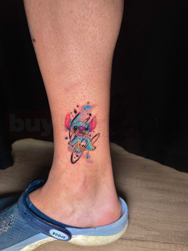 Ercan Tattoo’nun minimal ve renkli tarzını yansıtan bu Stitch dövmesi, eğlenceli ve enerjik bir tasarımdır. Canlı renk geçişleri ve sulu boya efekti sayesinde sade ama dikkat çekici bir görünüm sunar. Küçük boyutlu olmasına rağmen detaylı işçiliği ile öne çıkan bu dövme, özellikle bilek ve ayak bölgelerinde tercih edilen modern bir stil örneğidir.