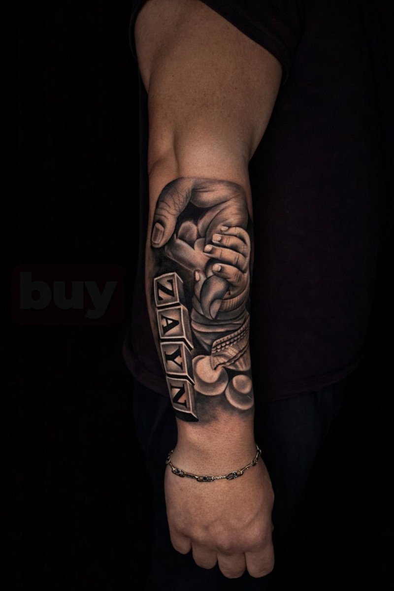 Ercan Tattoo’da hazırlanan bu özel tasarım, isim ve sembollerin birleşimi ile kişisel bir anlam taşır. Yazı fontu, gölgelendirme ve eklenen figürler tamamen kişiye özel planlanmıştır. Minimal ile detaylı stil arasında dengeli bir yapı sunar. Anlam yüklü dövme tercih edenler için ideal bir örnektir.