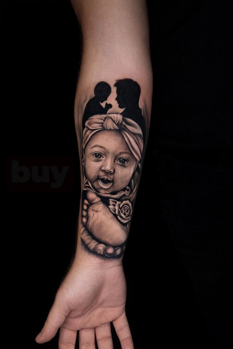 Bu duygusal dövme, aile bağlarını temsil eden güçlü bir tasarımdır. Bebek figürü ve arka plandaki silüetler, Ercan Tattoo’nun gerçekçi işçiliği ile hayat bulur. Yumuşak geçişler ve detaylı yüz ifadeleri, tasarımın etkisini artırır. Anı ve değer taşıyan dövmeler arasında en çok tercih edilen konseptlerden biridir.