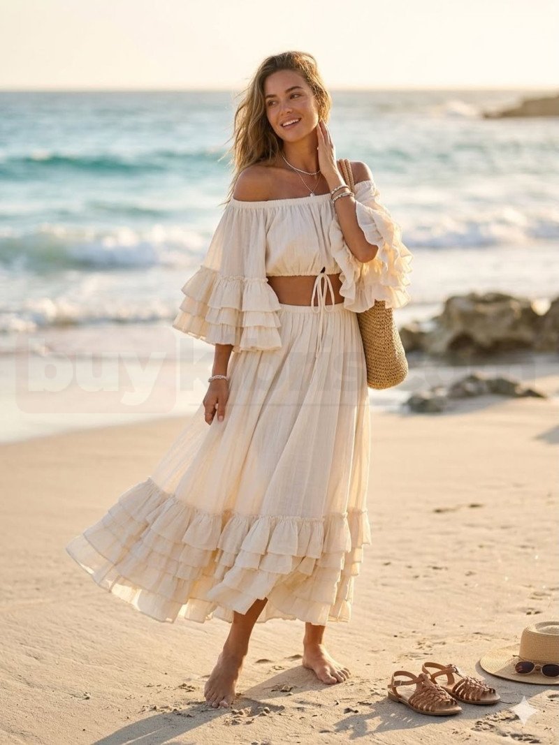 Rahat ve özgür bir stil sunan bu bohem kombin, yaz aylarında plaj şıklığını tamamlamak için tasarlandı. Hafif kumaşı, salaş kesimi ve doğal tonları ile hem konforlu hem de estetik bir görünüm sağlar. Gün batımı yürüyüşlerinden sahil kombinlerine kadar geniş bir kullanım alanına sahiptir. Senorita Butik’in Kıbrıs sahil stiline özel seçtiği parçalar arasında yer alır.