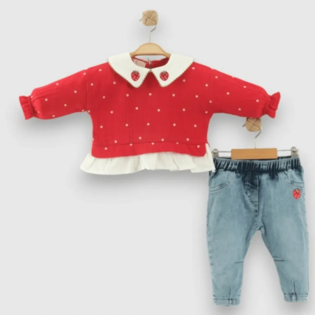 Sevimli ve dikkat çekici tasarımıyla öne çıkan bu kız bebek takımı, kırmızı süveter detayı ve kot pantolon uyumu ile hem şık hem enerjik bir görünüm sunar. Yumuşak dokulu kumaşı sayesinde bebeğinizin hassas cildine uyum sağlarken, esnek yapısı ile rahat hareket etmesine imkân tanır. Günlük kullanımda ve özel günlerde tercih edilebilecek bu takım, tarz sahibi minikler için ideal bir seçenektir.