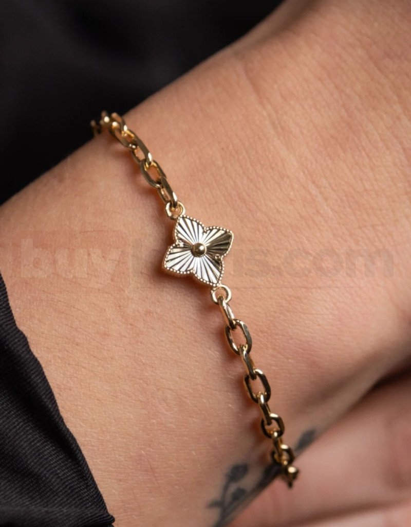 Zarif işçiliğiyle öne çıkan Şans Çiçeği Motifi, bu bilekliği hem modern hem de anlamlı bir aksesuar hâline getiriyor. Parlak altın tonundaki zinciri ve detaylı çiçek formu, bilekte sofistike bir duruş sağlar.