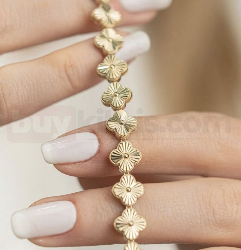 Birbirini takip eden zarif çiçek motifleriyle tasarlanan bu altın bileklik, bilekte romantik ve sofistike bir görünüm oluşturur. Her bir motifin ince detayları ışığı yansıtarak göz alıcı bir ışıltı sunar.