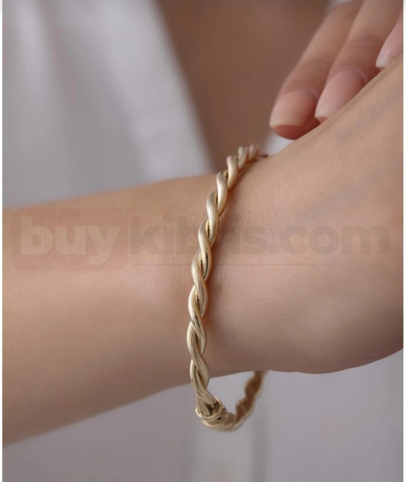Klasik burgu dokusunu modern bir çizgiyle buluşturan bu altın kelepçe bileklik, bilekte zarif ama dikkat çekici bir görünüm sunar. Burgu detayının oluşturduğu ışık oyunları, hareket ettikçe hoş bir ışıltı oluşturur.