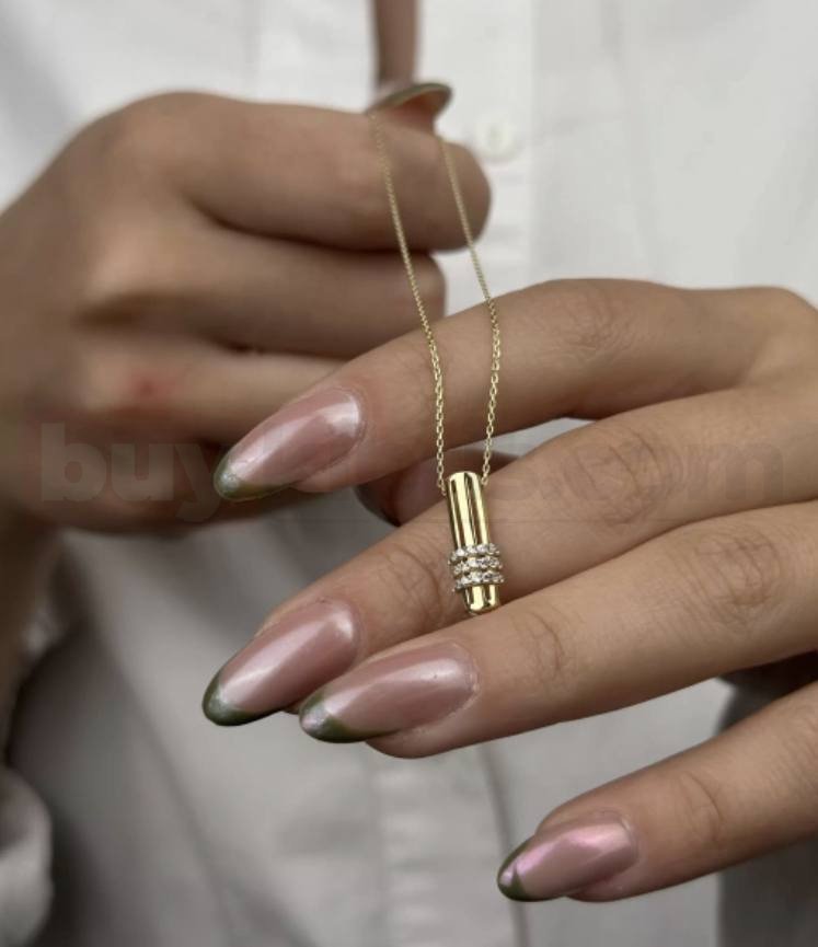 Modern çizgilerin güçlü bir yansıması olan çivi formlu altın kolye, minimal tasarımına rağmen dikkat çekici bir duruş sergiler. Pürüzsüz parlak yüzeyi ve zarif formu sayesinde günlük kullanımda sade bir şıklık, özel anlarda ise sofistike bir stil sunar.
