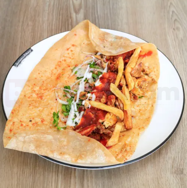 Tavuk döner, cips, soğan, salatalık turşusu, mayonez, sos