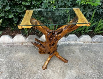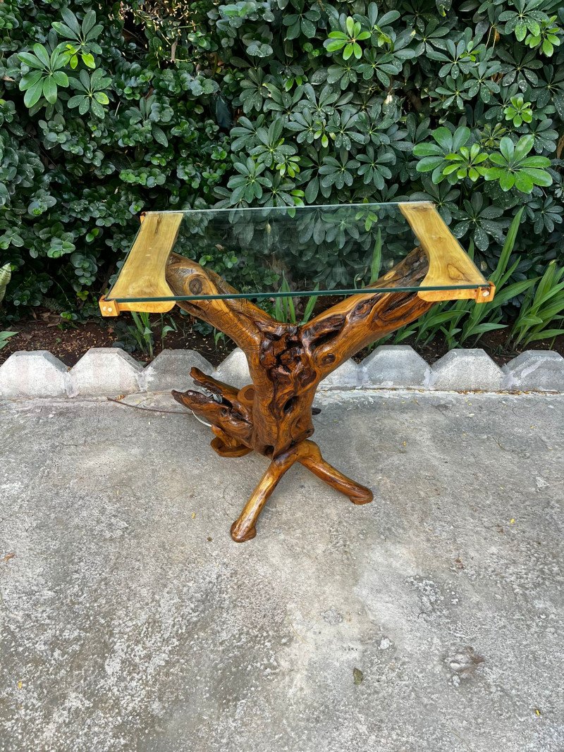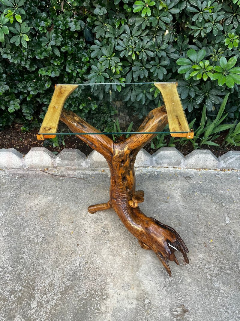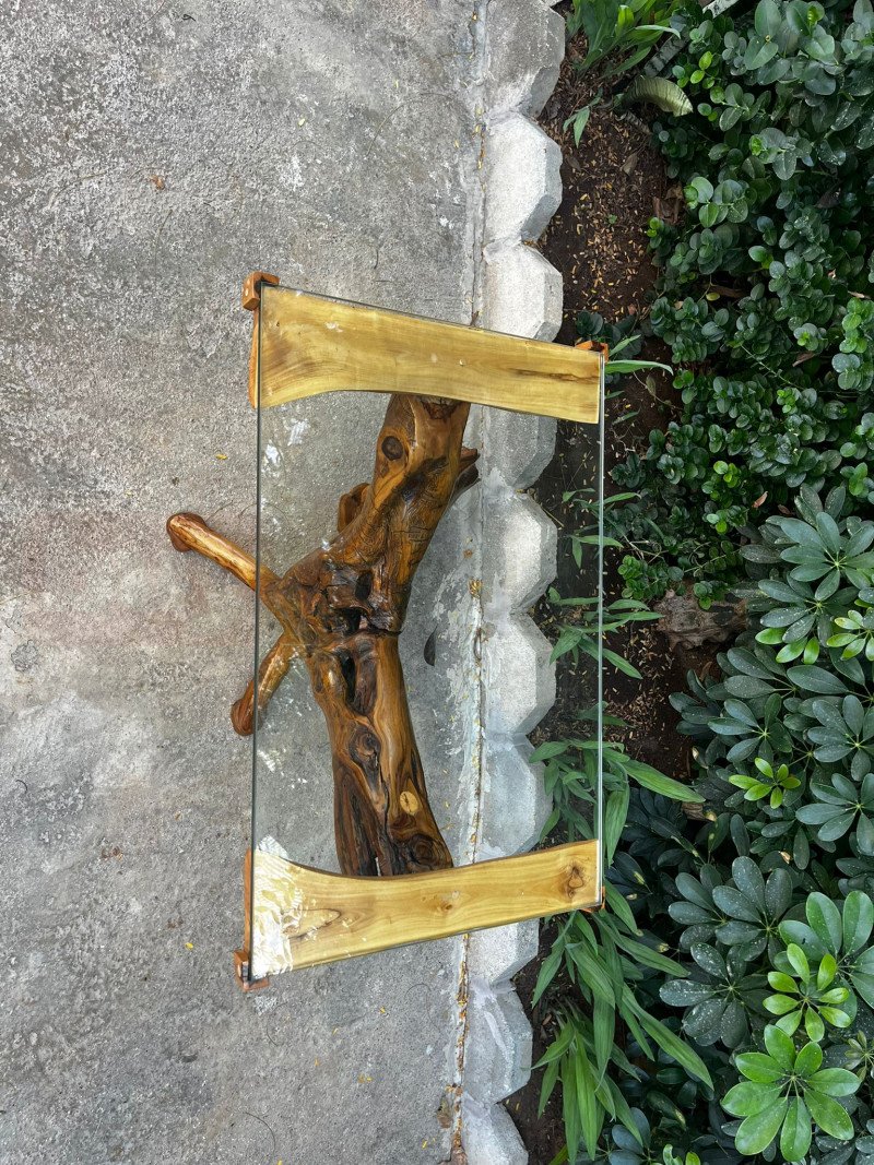 Üst kısımda kullanılan cam tabla, zeytin ağacının heykelsi yapısını tamamen görünür bırakırken modern bir şeffaflık ve zarafet katar. Sehpanın ayak bölümlerine eklenen destekleyici parçalar, sağlamlığı artıran işlevsel bir detaydır.