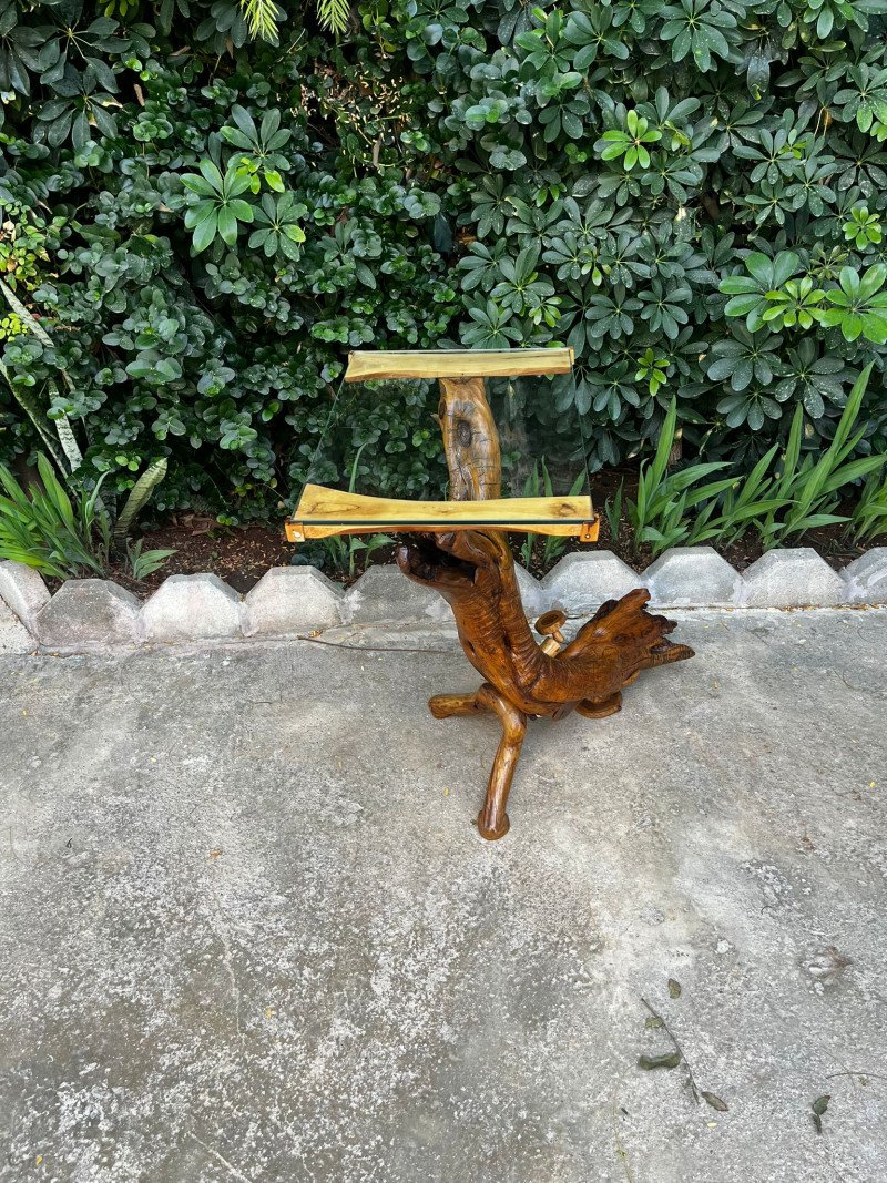 Doğanın köklü güzelliğini modern tasarım ile buluşturan bu ışıklı köşe sehpa, tamamen tek parça zeytin ağacı gövdesinden hazırlanmış özgün bir sanat ve dekorasyon çalışmasıdır. Zeytin ağacının yıllara dayanan doğal kıvrımları, kök detaylarını andıran güçlü formu ve sıcak tonları, sehpayı hem estetik hem de karakter sahibi bir obje haline getirir.
