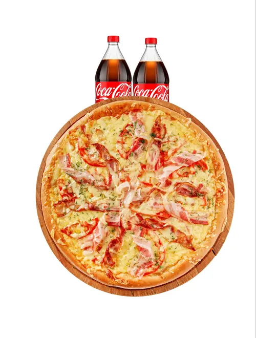(Domuz eti içerir.) Pizza sosu, peynir, mantar, yeşil biber, pepperoni, domuz bacon, zeytin