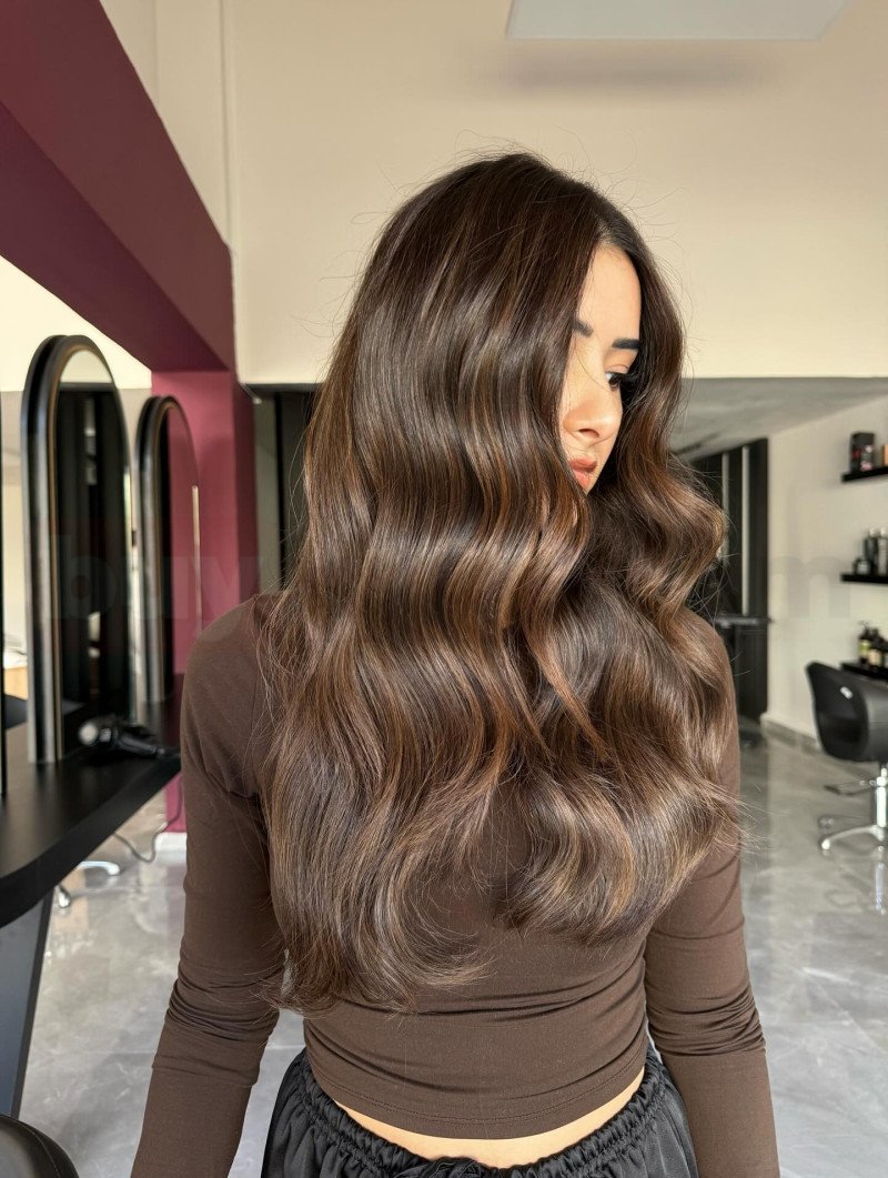 Doğal tonlarda ışıltılı balyaj, saçın kendi rengini koruyarak ona derinlik, parlaklık ve canlılık kazandırır.