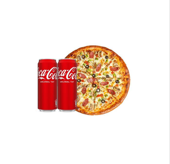 Pizza sosu, peynir, soğan, domates, dana pastırma, yeşil biber, zeytin