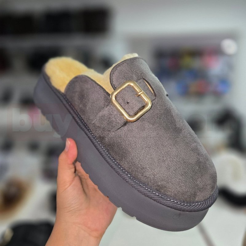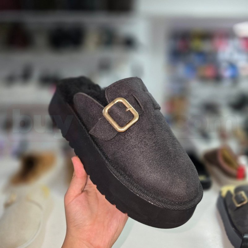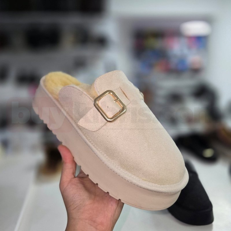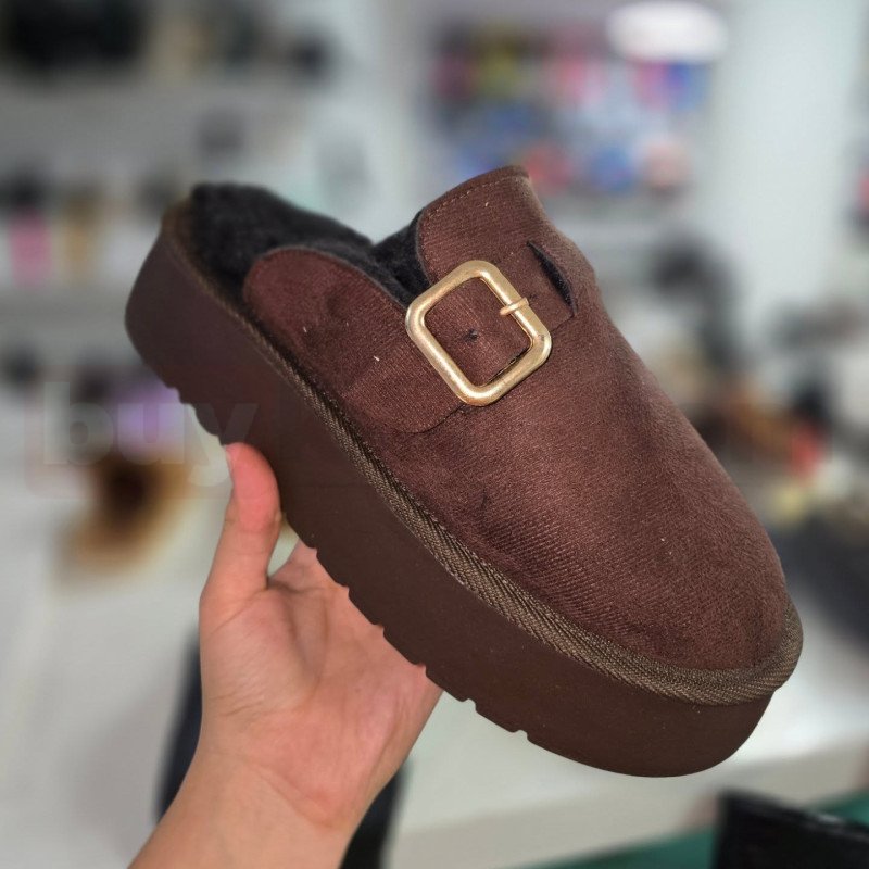 Tokalı peluş tabanlı kadın ev terliği, ev içinde maksimum rahatlık ve sıcaklık arayanlar için tasarlanmış konforlu bir modeldir. Yumuşak dokulu dış yüzeyi ve iç kısmındaki peluş astarı sayesinde ayağı sarar, soğuk havalarda ayakların sıcak kalmasına yardımcı olur. Üst kısımdaki metal tokalı detay, sade tasarıma şık ve modern bir dokunuş katar.