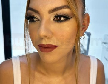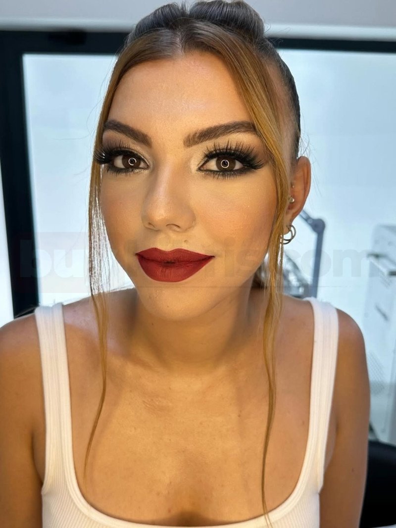 Belirgin göz makyajı, net kaş formu ve mat kırmızı dudaklarla tamamlanan bu profesyonel makyaj uygulaması; yüz hatlarını güçlü ve dengeli şekilde öne çıkarır. Topuz saç modeliyle uyumlu olarak hazırlanan görünüm, özel davetler, nişan, söz ve gece organizasyonları için idealdir. Kalıcı ürünlerle yapılan uygulama, gün boyu net ve bakımlı bir ifade sunar.