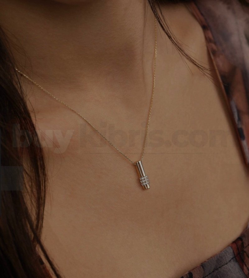 Silindir formundaki uç detayı ve taş süslemeleriyle sade ama modern bir tasarım sunar. İnce zinciri sayesinde boyunda hafif bir duruş sağlar ve günlük kullanım için uygundur.