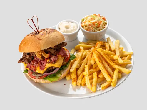 Burger köftesi, dana bacon, steak parçaları, çıtır soğan, cheddar peyniri, sarımsaklı mayonez, domates, marul, soğan, salatalık turşusu
