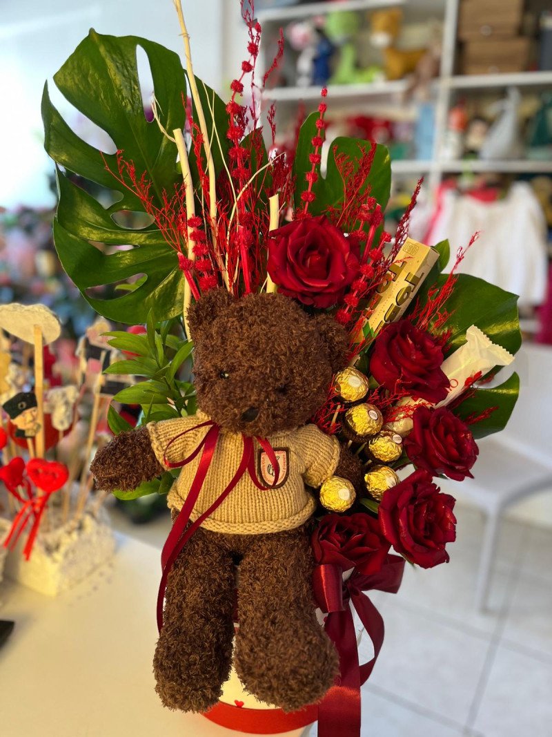 Kırmızı güllerin ciddiyeti, dekoratif ayıcık detayıyla yumuşatılarak dengeli bir kompozisyon oluşturulmuştur. Resmi çizgiyi korurken samimi bir mesaj iletmek isteyenler için ideal bir tercihtir. Özel günlerde, uzun soluklu iş ilişkilerini güçlendirmek amacıyla sunulabilecek modern ve dikkat çekici bir aranjmandır.