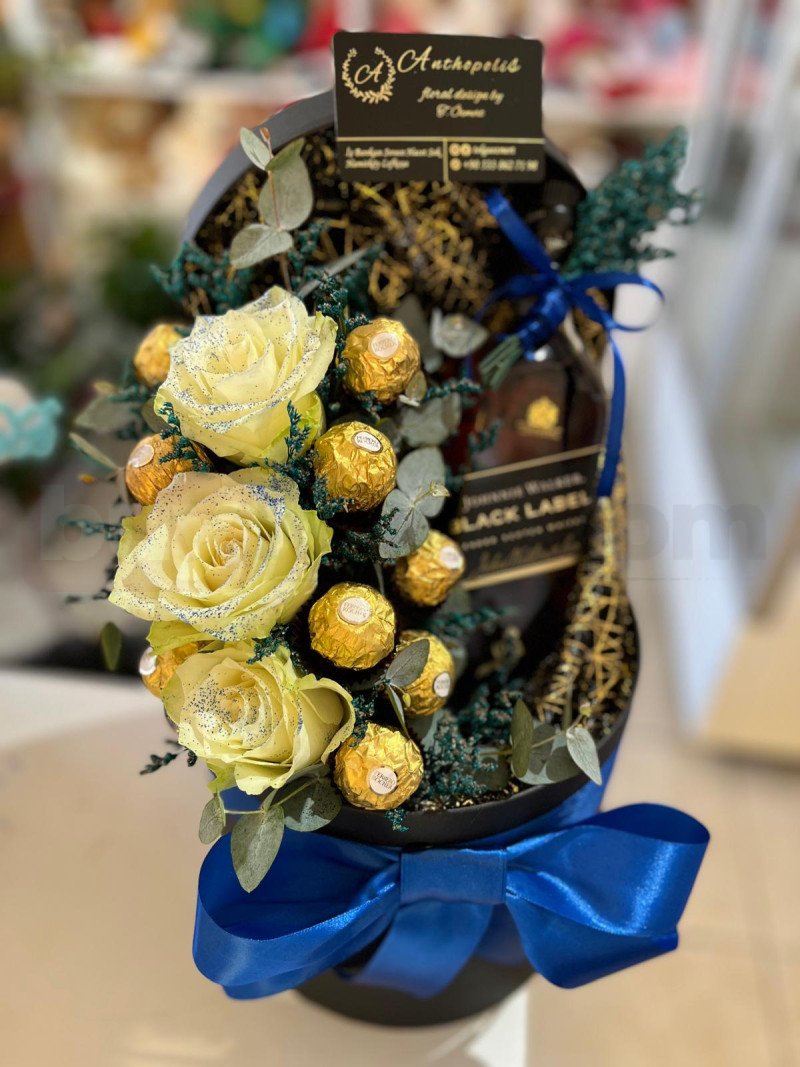 Beyaz güllerin zarafeti, seçkin içki ve premium çikolata detaylarıyla tamamlanarak lüks bir hediye anlayışı sunar. Bu aranjman; başarıyı, itibarı ve güçlü iş ilişkilerini temsil eder. Üst düzey yöneticiler, özel anlaşma kutlamaları ve VIP müşteri hediyeleri için tasarlanmıştır. Güçlü, prestijli ve etkisi uzun süre hissedilen bir sunumdur.