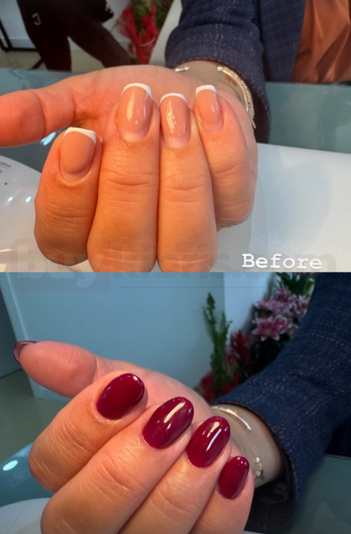 Uygulama öncesi doğal ve sade görünümden, uygulama sonrası derin ve sofistike bir tona geçiş; profesyonel el bakımının farkını net biçimde ortaya koymaktadır. Görselde yer alan dönüşüm, doğru renk seçimi, yüzeye eşit dağılan ürün ve yüksek parlaklık ile desteklenen titiz bir uygulama sürecini yansıtır.