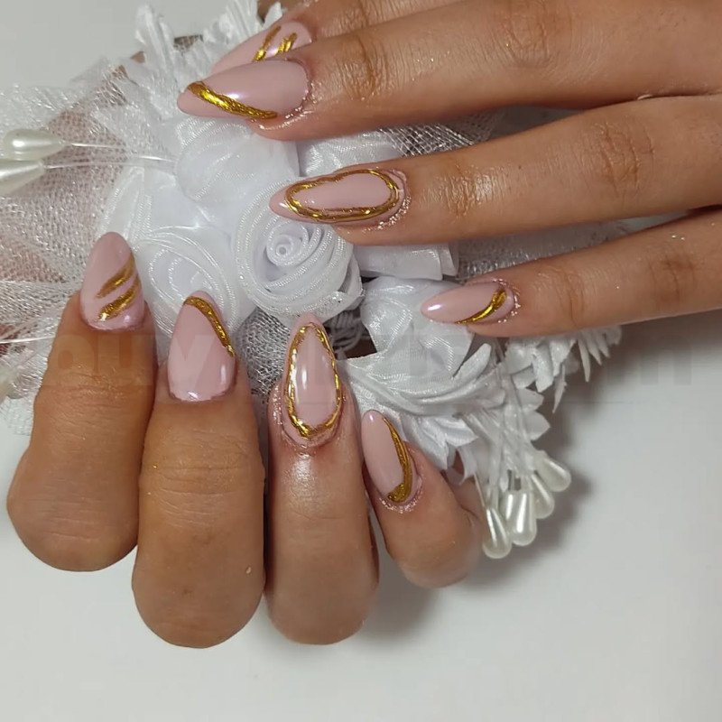 Soft nude zemin üzerine uygulanan altın çerçeve detayları, sade ama lüks bir görünüm sunar. Minimal fakat etkili çizgi çalışmaları sayesinde tırnaklara zarif bir hareket kazandırılmıştır. Hem günlük kullanım hem de özel organizasyonlar için rahatlıkla tercih edilebilecek zamansız bir modeldir. Parlak jel sistemi ile uygulanan altın detaylar ışık altında şık bir yansıma sağlar. Elegant ve sofistike bir stil arayanlar için güçlü bir alternatiftir.