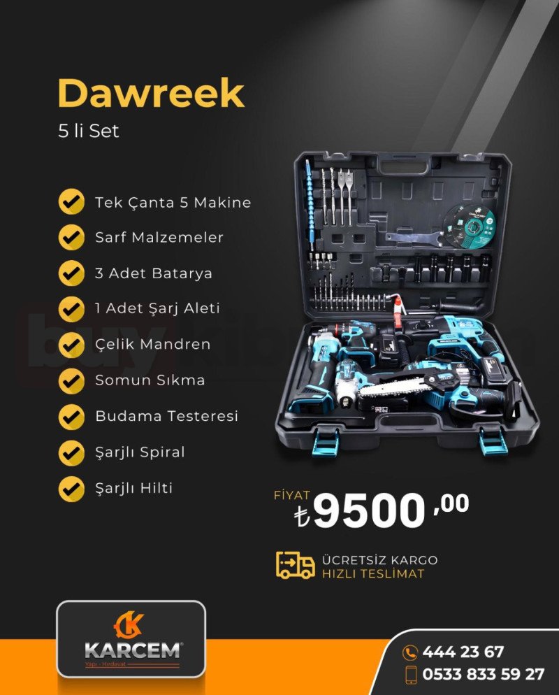 Tek çanta içerisinde 5 farklı makine ve zengin sarf malzemeleri ile çok yönlü kullanım sunar. 3 adet batarya, şarj aleti, çelik mandren, somun sıkma, budama testeresi, şarjlı spiral ve şarjlı hilti özellikleriyle güçlü bir settir. 9500 TL fiyatla, ücretsiz kargo ve hızlı teslimat avantajıyla satıştadır.
