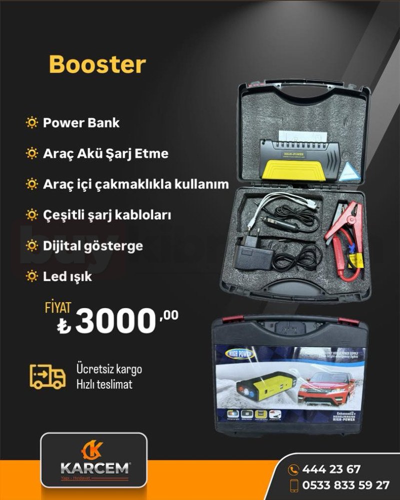Araç aküsü şarj etme özelliği ve powerbank fonksiyonu ile çok amaçlı kullanım sunar. Araç içi çakmaklıkla kullanım, dijital gösterge, LED ışık ve çeşitli şarj kabloları ile tam donanımlı settir. 3000 TL fiyatla, ücretsiz kargo ve hızlı teslimat avantajıyla satıştadır.