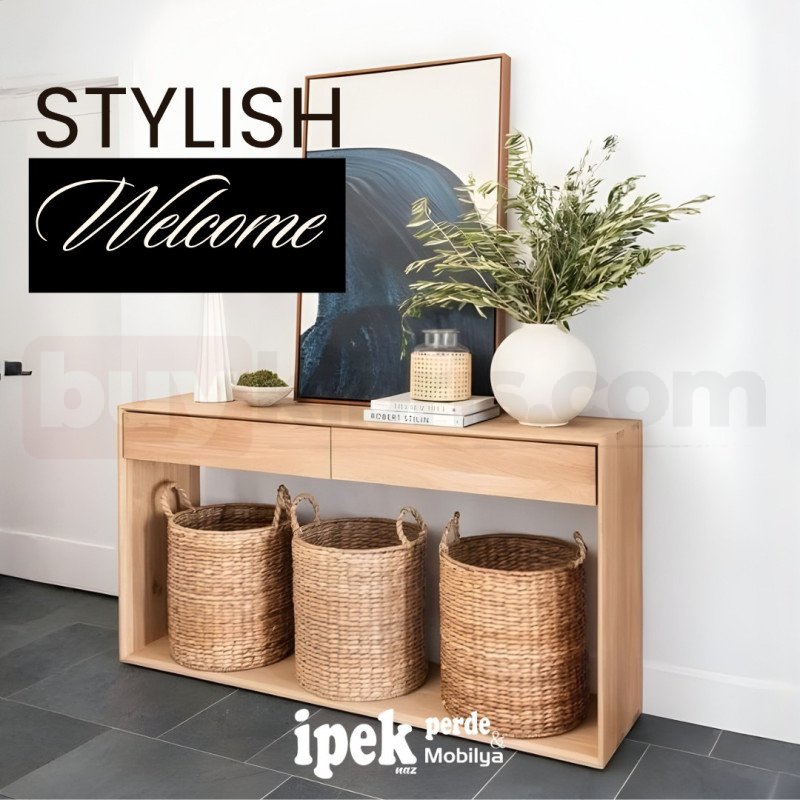 Bu modern ahşap dresuar modeli, sade tasarımı ve doğal dokusuyla giriş alanlarına ve salonlara şık bir karşılama alanı oluşturur. Açık ahşap tonu, mekâna sıcaklık katarken minimal formu sayesinde ferah ve düzenli bir görünüm sağlar. Üst yüzeyi; tablo, vazo, mum veya dekoratif objeler için estetik bir sergileme alanı sunar.