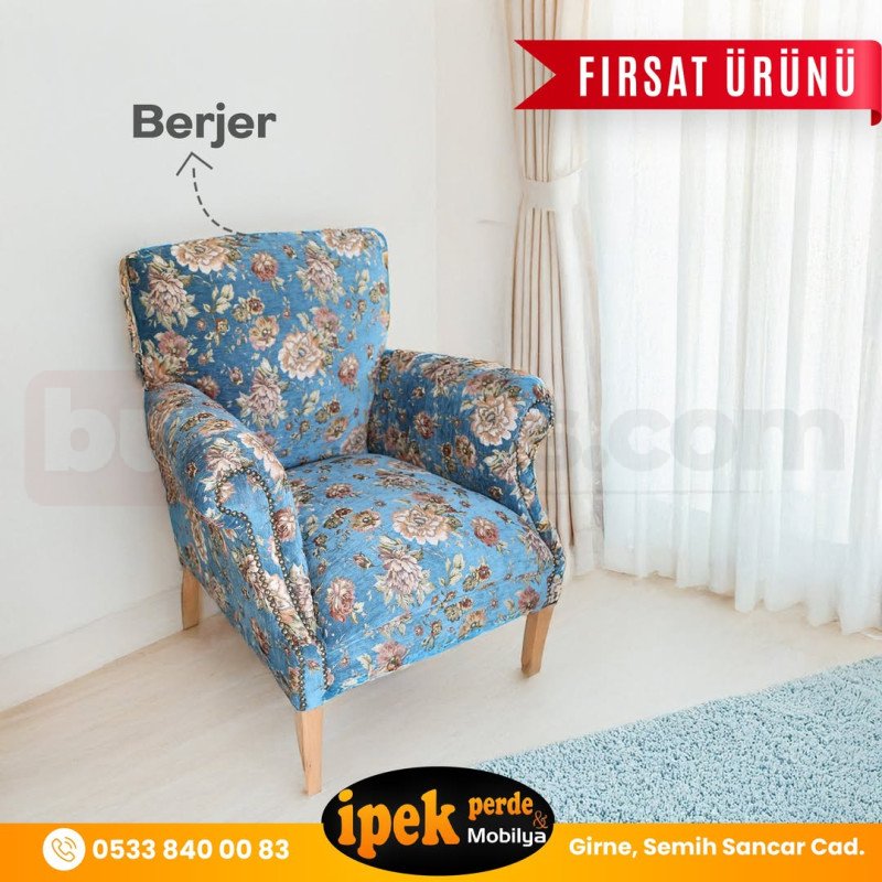 Çiçek desenli döşemesi ve zarif formuyla dikkat çeken bu berjer, yaşam alanlarınıza sıcak ve nostaljik bir hava katar. Mavi zemin üzerine işlenmiş klasik floral desenler, mekâna canlılık ve karakter kazandırırken, ahşap ayak detayları doğal ve dengeli bir görünüm sunar.