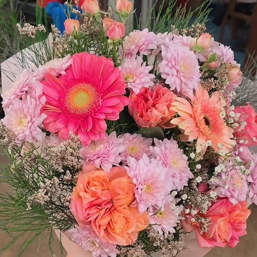 Canlı pembe gerbera, somon güller ve pastel tonlardaki krizantemlerin uyumuyla hazırlanan zarif bir buket tasarımı. Yumuşak renk geçişleri sayesinde hem romantik hem de enerjik bir görünüm sunar. Doğal yeşillik ve dolgu çiçekleriyle zenginleştirilen aranjman, özel günlerde sevdiklerinize şık ve anlamlı bir hediye alternatifi oluşturur. Bulunduğu ortama tazelik ve sıcak bir atmosfer katar.