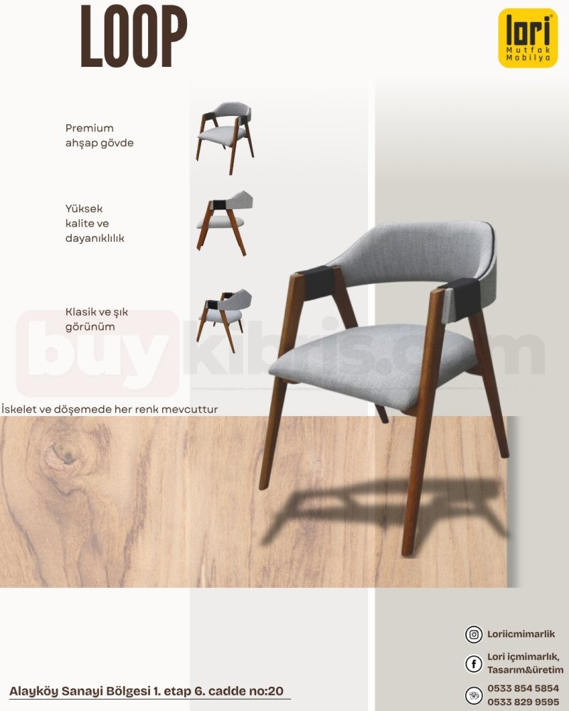 Lori Mutfak olarak LOOP modelinde iskelet ve döşeme renk seçenekleri kişiye özel sunulmaktadır. Ahşap tonları, kumaş ve kaplama alternatifleri talebe göre uygulanır. Tasarım, üretim ve kalite kontrol süreçleri profesyonel ekip tarafından yürütülerek estetik ve dayanıklı mobilya çözümleri sunulmaktadır.